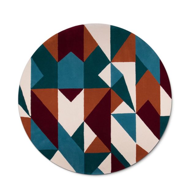 Ένα συνθετικό χαλί από tencel με χαμηλό πέλος κλέβει τις εντυπώσεις χάρη στα έντονα γεωμετρικά του σχήματα και τα ζωηρά του χρώματα που μαζί πετυχαίνουν το ζητούμενο πληθωρικό αποτέλεσμα.