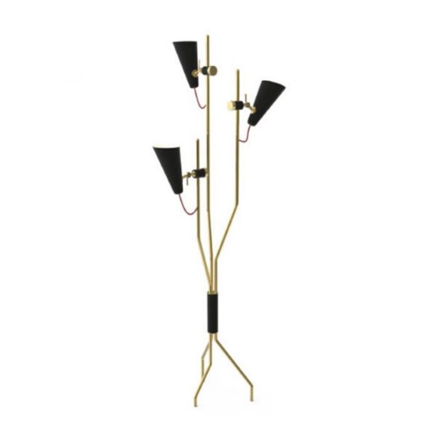Το φωτιστικό δαπέδου με τον μέγιστο φωτισμό είναι εμπνευσμένο από την εποχή των ‘50s χάρη στον χρυσό σκελετό και τις μαύρες λεπτομέρειές του. Έχει ύψος 1,88 μέτρα και αποτελείται από τρεις λάμπες που είναι ρυθμιζόμενες για να στέλνεις το φως εκεί ακριβώς που θέλεις.