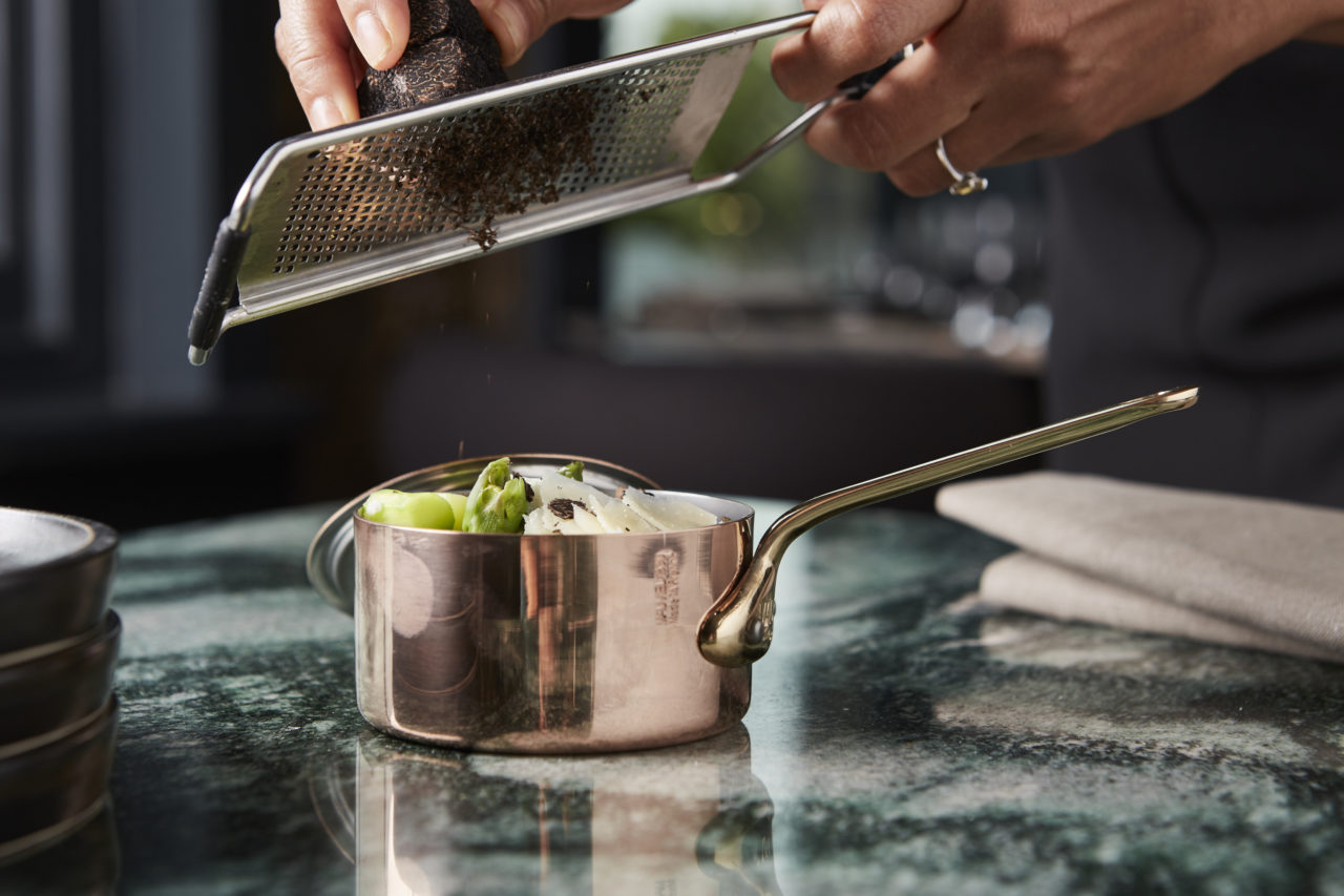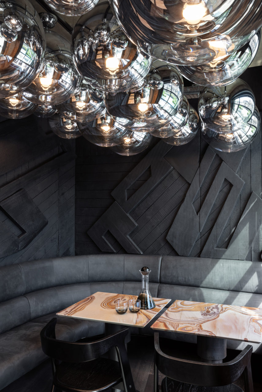 Όσον αφορά την εσωτερική διακόσμηση, τα διάσημα φωτιστικά ‘Melt’ του Dixon, είναι τα πρώτα που τραβούν την προσοχή των επισκεπτών στην τραπεζαρία, ενώ την τιμητική τους έχουν και τα ‘Fat’ σκαμπό μπαρ του σχεδιαστή. Στο εστιατόριο συναντάμε κι άλλα εμβληματικά έπιπλα, φωτιστικά και διακοσμητικά του Tom Dixon.